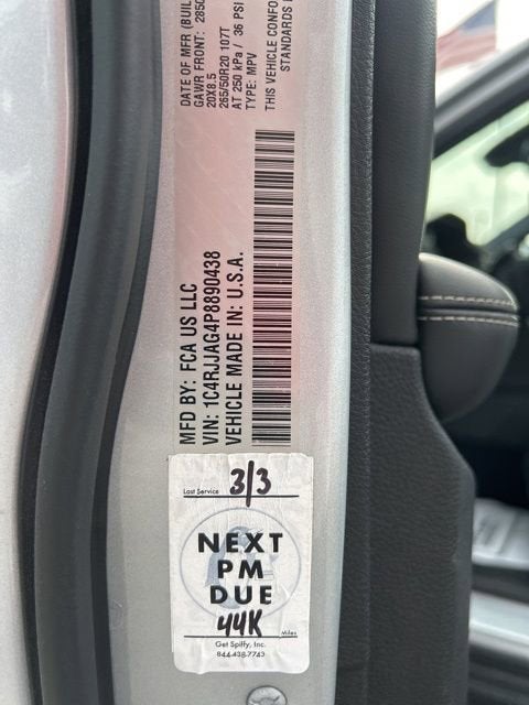 138 POINT CERTIFIED INSPECTION PASSED, 3RD ROW SEATING, AUTOMATIC HEADLIGHTS, BLIND SPOT MONITORING, Bluetooth®, CLEAN CARFAX, HEATED FRONT SEATS, INCLUDES THE REMAINDER OF THE FACTORY WARRANTY, MULTI FUNCTION STEERING WHEEL, ONE OWNER, POWER LIFTGATE, REAR BACK UP CAMERA, SPECIAL INTEREST RATES AVAILABLE, APPLE CARPLAY / ANDROID AUTO, Remote Keyless Entry w/Integrated Key Transmitter, Illuminated Entry and Panic Button, Remote Start System, Heated Steering Wheel, Black Power Heated Side Mirrors w/Manual Folding, 115V Auxiliary Power Outlet, 3rd Row Charge-Only USB Ports, 3rd row seats: split-bench, 4-Wheel Disc Brakes, 6 Speakers, ABS brakes, Air Conditioning, Altitude Appearance Package, Anti-whiplash front head restraints, Automatic temperature control, Black Headliner, Brake assist, Bumpers: body-color, Capri Leatherette/Suede Seats, Cloth Seats, Compass, Delay-off headlights, Delete Laredo Badge, Driver door bin, Driver vanity mirror, Dual front impact airbags, Dual front side impact airbags, Electronic Stability Control, Emergency communication system, Four wheel independent suspension, Front anti-roll bar, Front Bucket Seats, Front Center Armrest w/Storage, Front dual zone A/C, Front License Plate Bracket, Front reading lights, Fully automatic headlights, Gloss Black Exterior Accents, Heated door mirrors, Heated Front Seats, Heated Steering Wheel, Illuminated entry, Knee airbag, Low tire pressure warning, Manual Fold Seatbacks, Molded In Color Black/Gloss Black Roof Rails, Normal Duty Suspension, Occupant sensing airbag, Outside temperature display, Overhead airbag, Overhead console, Panic alarm, ParkView Rear Back-Up Camera, Passenger door bin, Passenger vanity mirror, Power door mirrors, Power driver seat, Power Liftgate, Power steering, Power windows, Quick Order Package 23B Altitude, Radio: Uconnect 5 w/8.4 Display, Rain Sensitive Windshield Wipers, Rear air conditioning, Rear anti-roll bar, Rear reading lights, Rear window defroster, Rear window wiper, Reclining 3rd row seat, Remote keyless entry, Remote Start System, Security system, Selectable Tire Fill Alert, Speed control, Speed-Sensitive Wipers, Split folding rear seat, Spoiler, Steering wheel mounted audio controls, Tachometer, Telescoping steering wheel, Tilt steering wheel, Traction control, Trip computer, Variably intermittent wipers, Voltmeter, Wheels: 20 x 8.5 Gloss Black Painted Aluminum, Wireless Charging Pad. RWD 8-Speed Automatic 3.6L V6 24V VVT